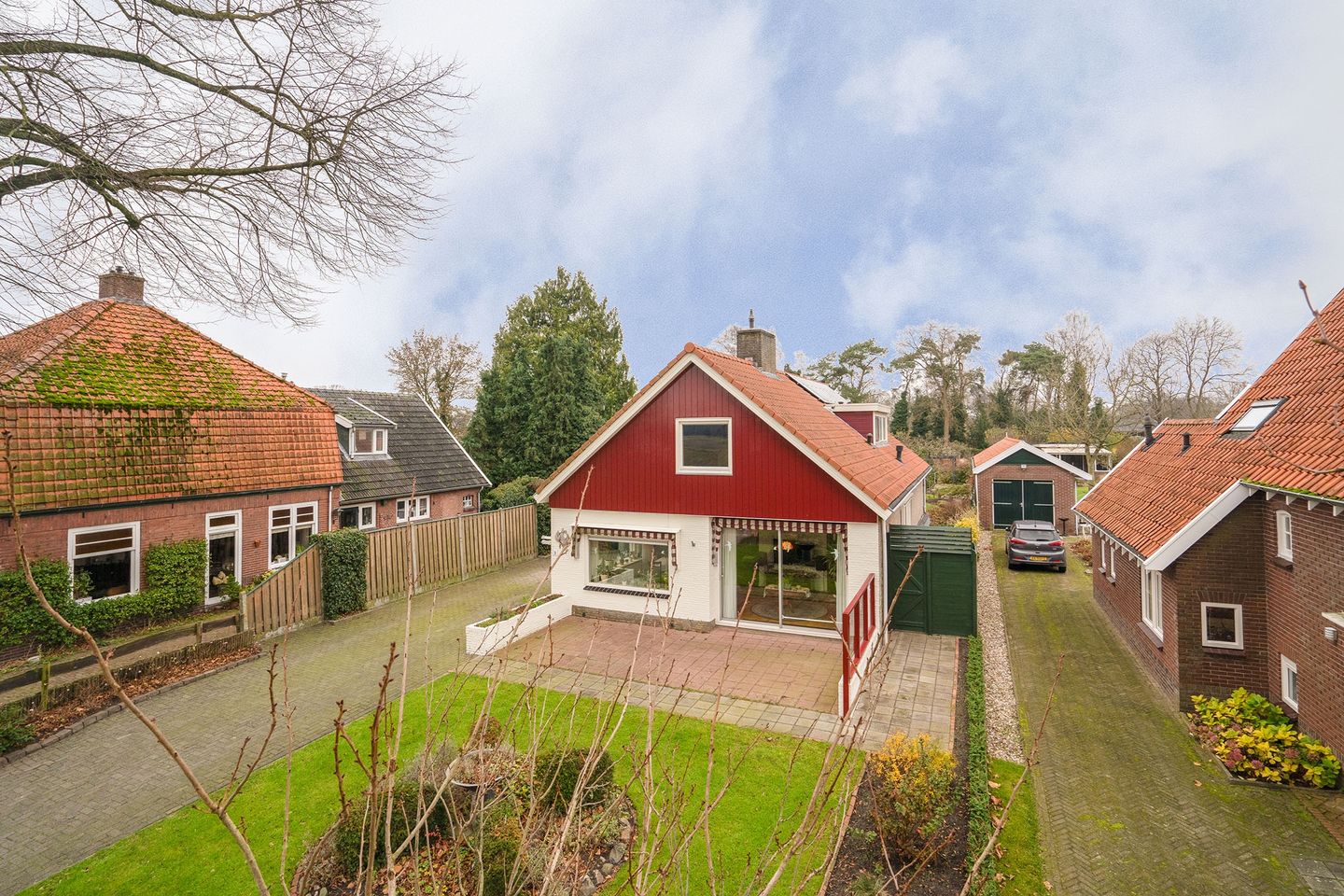Achter de woning bevindt zich een broeikas, stenen garage/berging met aangebouwde overkapping en een prachtig aangelegde achtertuin. Er zijn meerdere zitplekken, zodat je altijd kunt kiezen tussen zon of schaduw. Vanuit de woonkamer én het zonneterras voor het huis kun je eindeloos genieten van het weidse uitzicht over het omliggende agrarische landschap.