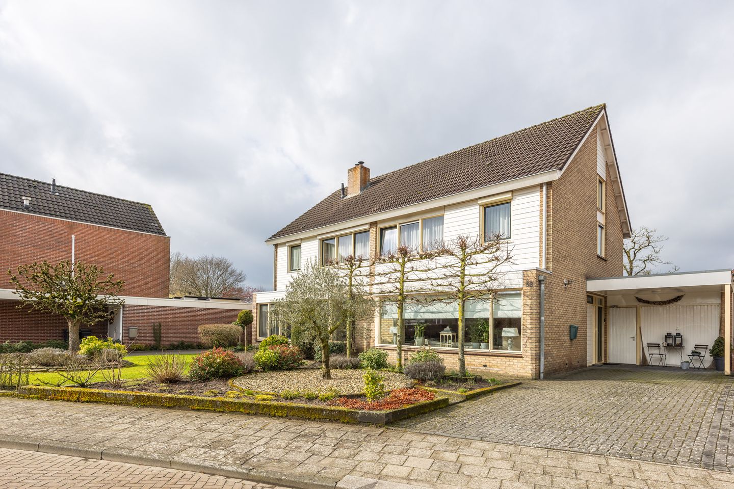 Je stapt droog en comfortabel binnen via de carport. De ruime hal verwelkomt je met een mooie nis voor de garderobe, een toilet en toegang tot de rest van de woning. Vervolgens kom je in de lichte woonkamer, waar de grote erker zorgt voor extra daglicht en de sfeervolle haard het warme middelpunt van de ruimte vormt. Hier kun je heerlijk ontspannen na een lange dag. De parketvloer voegt extra warmte en charme toe.