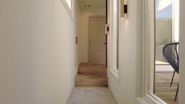 Entrance, hall with an intercom system that can also be operated via phone if desired. Through a beautiful wooden interior door, you enter the spacious and cozy living room, which features a fantastic high ceiling, smooth plastered walls, and characteristic stained-glass windows. Furthermore, the entire home features beautiful herringbone hardwood flooring with underfloor heating. Thanks to the many windows, the home is wonderfully bright. Adjacent is the luxurious open kitchen, equipped with various built-in appliances, namely: a Bora induction cooktop, dishwasher, Quooker, combination oven/microwave, and a fridge-freezer. From the kitchen, there is access to the sunny terrace where you can sit outside in peace and quiet. Practical indoor storage room. Hallway with access to a modern wall-mounted toilet with a hand basin.