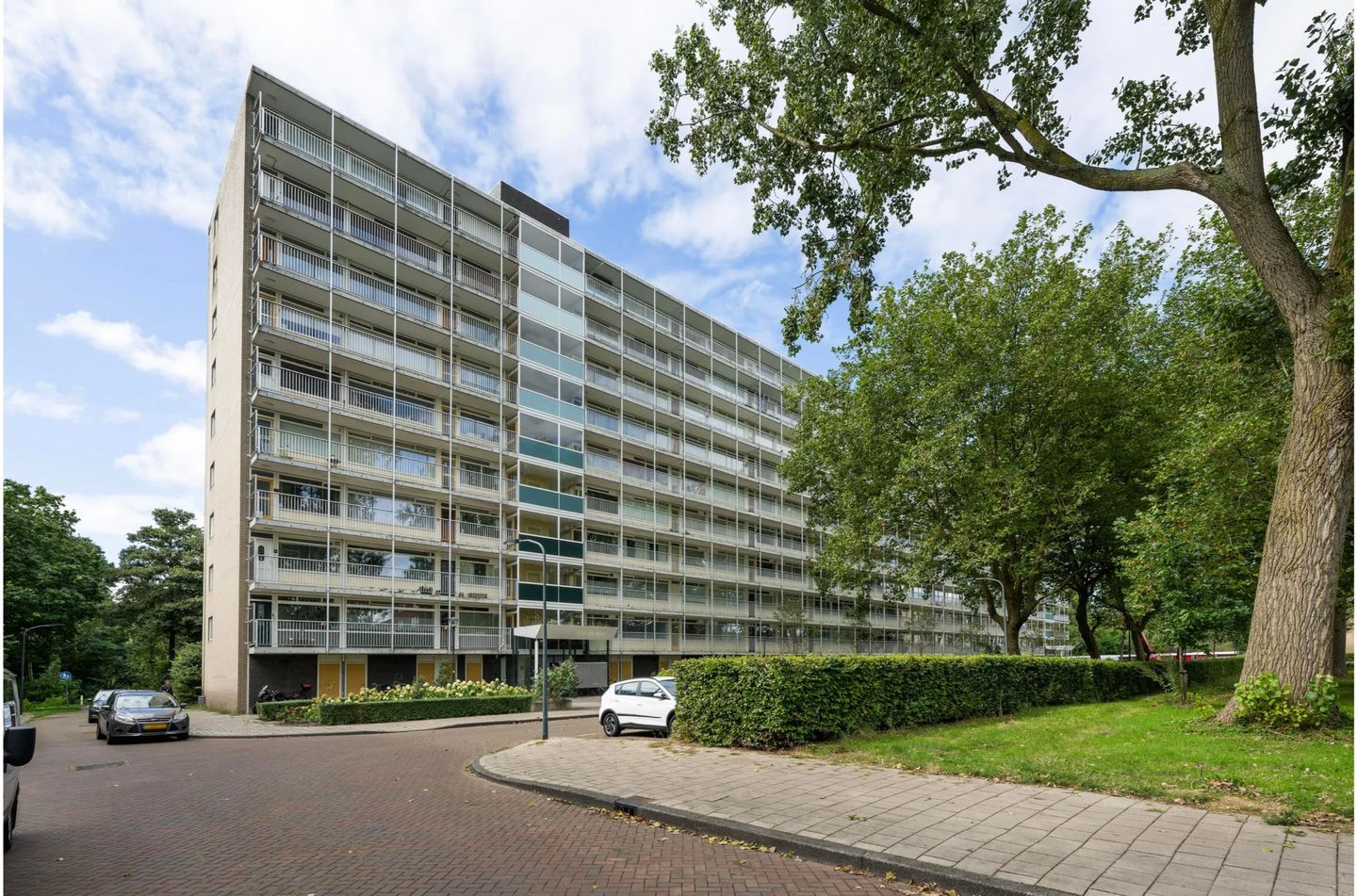 Vanuit het woongedeelte bereik je de hal, die toegang biedt tot de verschillende vertrekken. De hoofdslaapkamer is licht en ruim en heeft, net als de woonkamer, directe toegang tot het balkon op het westen. Daarnaast vind je hier de badkamer met toilet en een apart tweede toilet. Aan de andere zijde van de hal ligt een tweede slaapkamer, voorzien van praktische inbouwkasten.