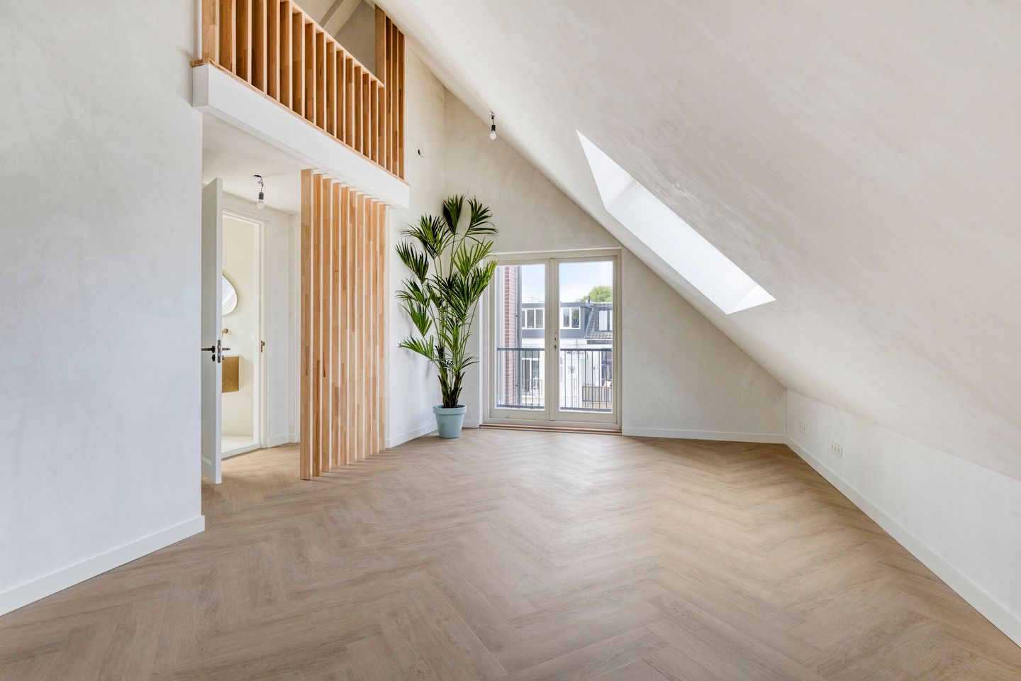 Ruime slaapkamer aan de achterzijde met royale nokhoogte en tevens met fraaie PVC vloer en openslaande deuren naar het zonnige balkon.