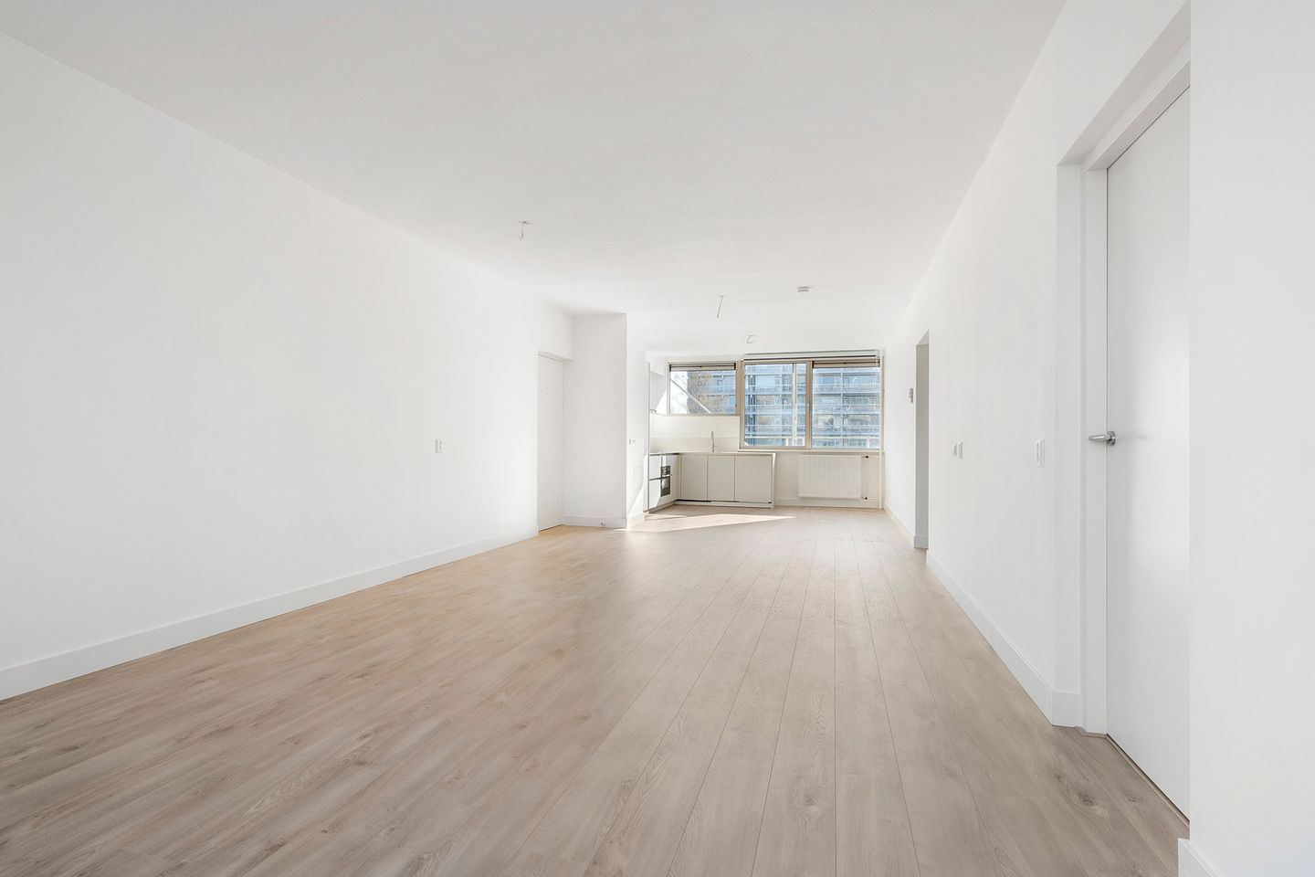 Entree/hal, ruime lichte woonkamer met vrij uitzicht en dubbel glas. Naast de woonkamer is een ruime slaapkamer gelegen. Deze kan eventueel bij de woonkamer betrokken worden. Hier kan zelfs de keuken worden gerealiseerd om een open woonkeuken met woonkamer te realiseren. Vanuit deze kamer heb je toegang tot het zonnige balkon op het westen. Vanuit de woonkamer en vanaf het balkon is er vrij uitzicht over het park.