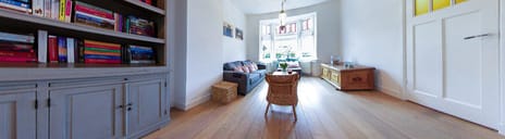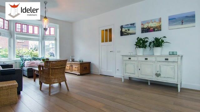 Daarna kom je in de lichte en ruime, extra brede woonkamer met charmante erker voorzien van originele glas in lood ramen, hoge plafonds, houten vloerdelen, originele paneeldeuren en veel sfeer.