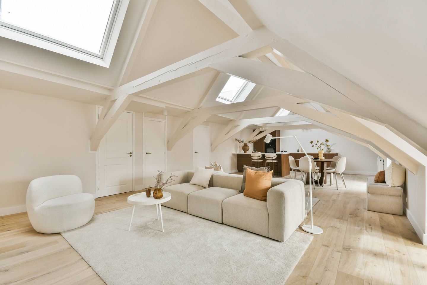 Dit appartement is gelegen op de bovenste etage en heeft een uniek dakterras van ca. 35 m2. Daarnaast beschikt het appartement over 126 m2 woonoppervlakte, een luxe badkamer, 2 slaapkamers en een sfeervolle woonkamer waar de balken van de dakconstructie zichtbaar zijn. Dit appartement is verder keurig afgewerkt met een houten lamel parket vloer, gestuukte wanden en plafond en voorzien van KVIK keuken met inbouwapparatuur. Daarnaast is er een eigen privé berging met onder andere een wasmachine- en drogeraansluiting.