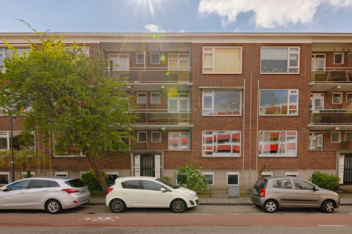 Eerste verdieping: voordeur, toilet met fontein, nette keuken aan voorzijde met deur naar balkon op het westen, woonkamer met vaste kast, groot raam en deur naar balkon. Zeer ruime slaapkamer aan achterzijde met deur naar balkon op het oosten, tweede slaapkamer met vaste kast en deur naar balkon, eenvoudige badkamer met douche en wastafel.