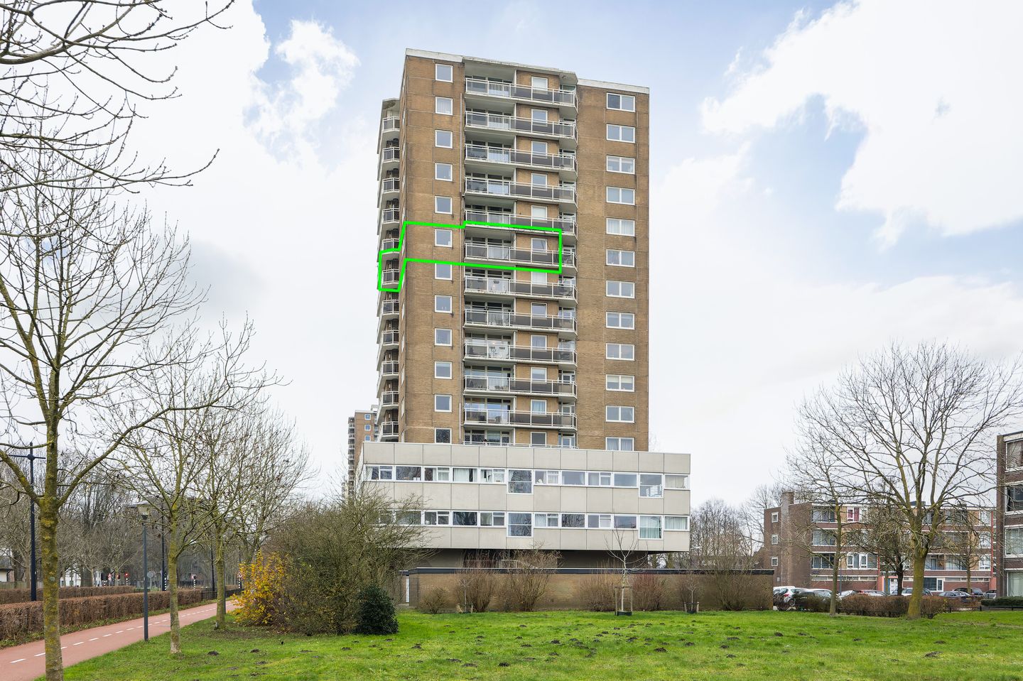 De woning ligt op de 10e verdieping van een goed onderhouden appartementencomplex.