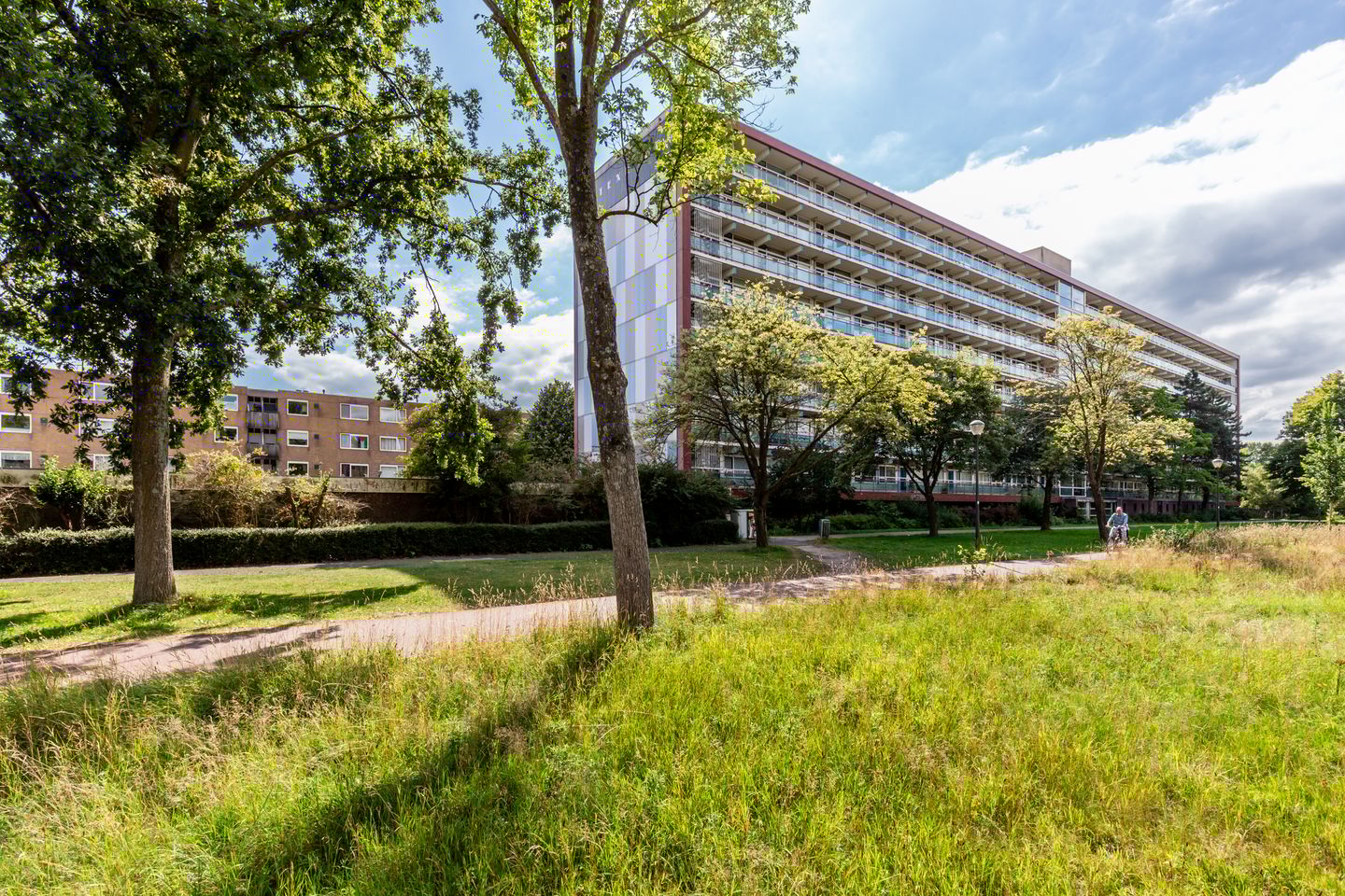 We nemen je mee naar de tweede verdieping van dit goed onderhouden appartementencomplex. Het appartement is bereikbaar via zowel de lift als het trappenhuis, en heeft een fijne ligging aan de rand van Schalkwijk, rustig, groen en op de grens met Heemstede.