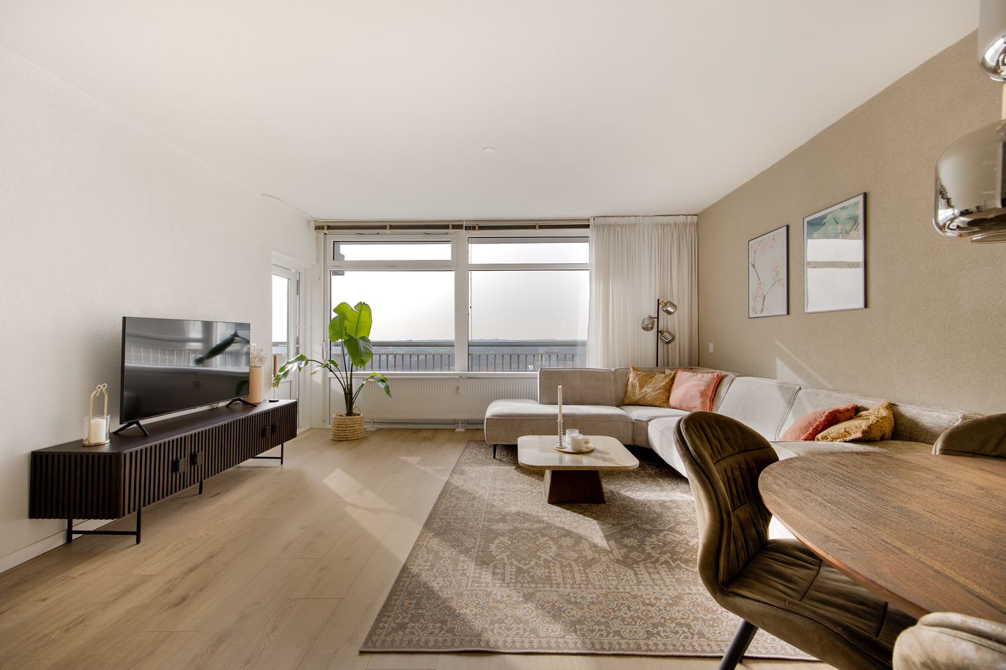 13e etage: entree, hal met videofoon installatie. De sfeervolle woonkamer is voorzien van strakke wanden en een fraaie laminaatvloer. De grote raampartij zorgt ervoor dat deze heerlijk licht is. Vanuit de woonkamer kun je het lekker zonnige balkon (west) bereiken. Vanuit het appartement heb je een heerlijk vrij en weids uitzicht. De moderne open keuken is voorzien van diverse inbouwapparatuur t.w.: een combi oven/magnetron, koelkast/vriezer, inductie kookplaat en een vaatwasser. Aangrenzend is een bergruimte gelegen. De moderne luxe badkamer (2023) is voorzien van een ruime inloopdouche, een zwevend toilet, een modern wastafelmeubel en de aansluiting voor de wasmachine-/droger. Vanuit de slaapkamer kun je ook het zonnige balkon bereiken.