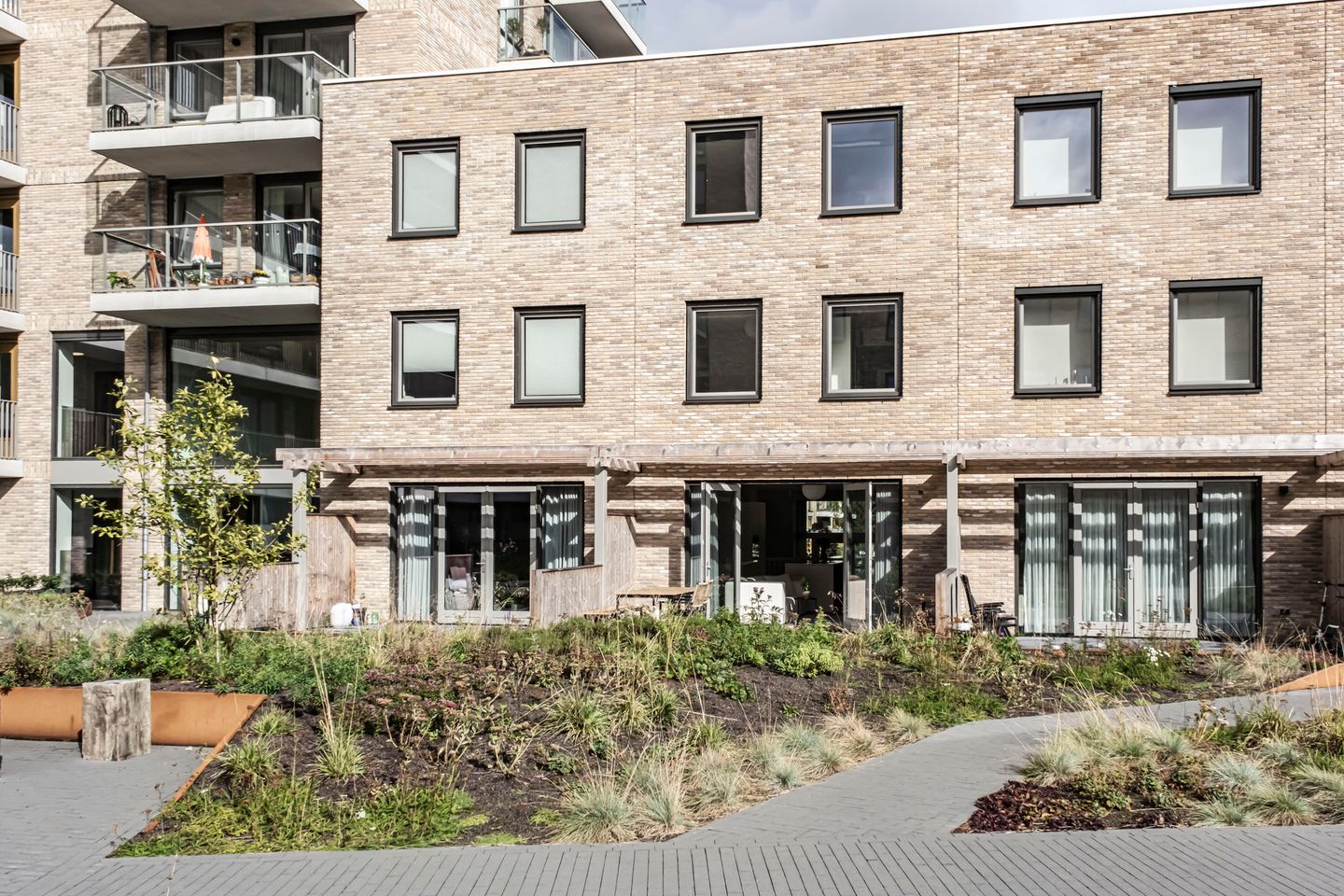 Onderhoudsvrije tuin met toegang tot binnentuin.