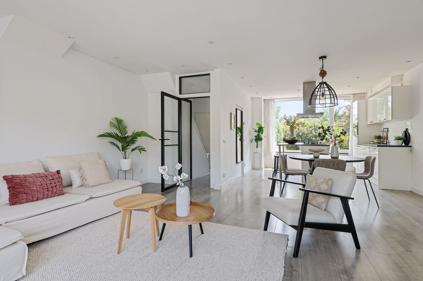 Entree met hal, meterkast en modern toilet met fonteintje. Moderne deur naar lichte, royale woonkamer met open keuken en sfeervolle gashaard. Openslaande deuren naar de zonnige tuin met berging.