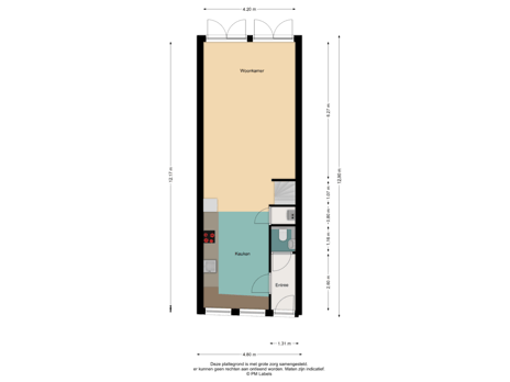 - 21 m² (5,00 meter diep en 4,20 meter breed)