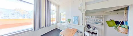 Overloop, twee 2-kamerstudio's met eigenbadkamer en keuken opstelling.