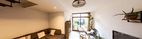 This house features a lovely, bright living room with an adjoining semi-open kitchen – a wonderful place to relax or enjoy a meal. Sliding doors open directly onto the sunny west-facing garden.
