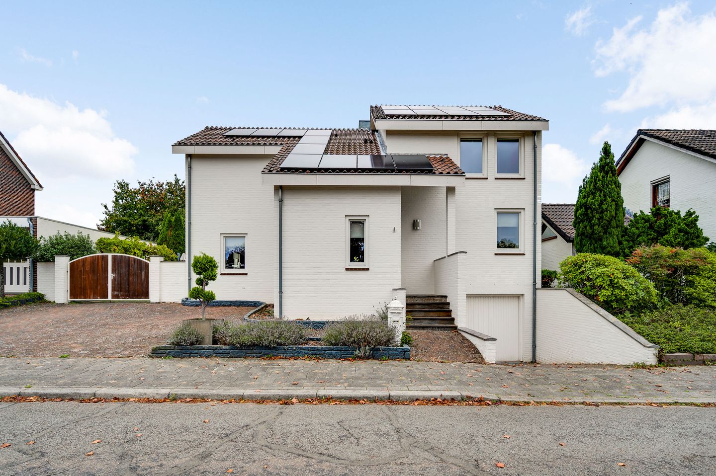 Aan de voorzijde ligt een brede, verzorgde oprit met parkeerruimte voor drie auto’s en een afsluitbare poort met eigen achterom.