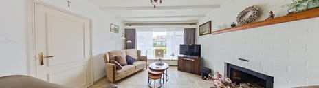 De woonkamer beschikt over een sfeervolle haard en heeft veel lichtinval door de grote ramen aan de voor- en achterzijde. Vanuit de woonkamer en de hal is de keuken bereikbaar.
