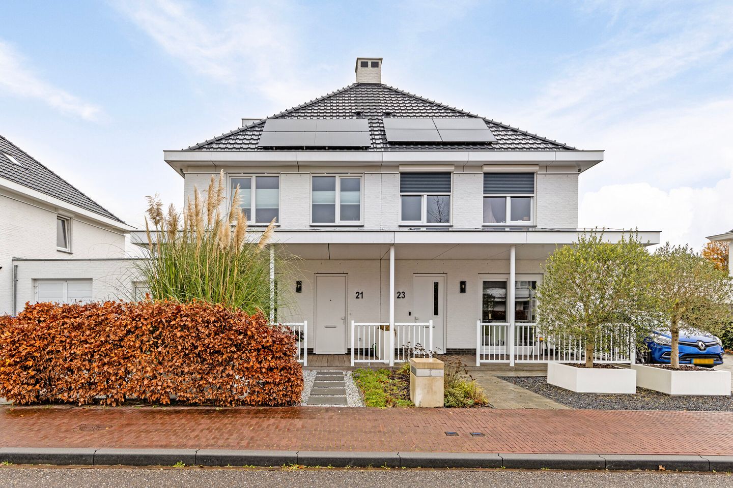 Voortuin gelegen op het zuiden, v.v. ruime oprit waar u twee auto`s kunt plaatsen, sierbestrating, plantenborders en heerlijke veranda van 10 m².