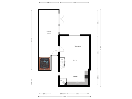 •Woonkamer + open keuken: ca. 40 m²