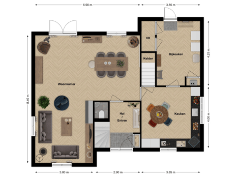 Een woonkeuken waar gezelligheid centraal staat! De keuken is ingericht met een praktische hoekopstelling en voorzien van een inductiekookplaat, schouw, koelkast, vaatwasser, combimagnetron en een koffiezetapparaat. Warm water is direct beschikbaar via de quooker. Vanuit de keuken bereik je bovendien de bijkeuken en de koele kelderruimte.