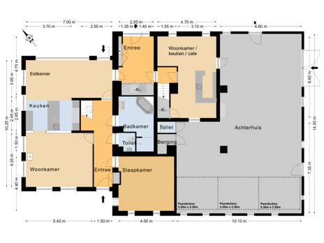 Begane grond: Entree. Hal met toegang tot diverse vertrekken. Sfeervolle woonkamer voorzien van grote raampartijen en prachtig zicht op de tuin. Royale woonkeuken uitgerust met modern inbouwapparatuur. Gezellige eetkamer. Bijkeuken met wasmachine- en overige aansluitingen. 1 slaapkamer, met ensuite badkamer voorzien van wastafel, bad en inloopdouche. Ruim achterhuis met drie paardenboxen.