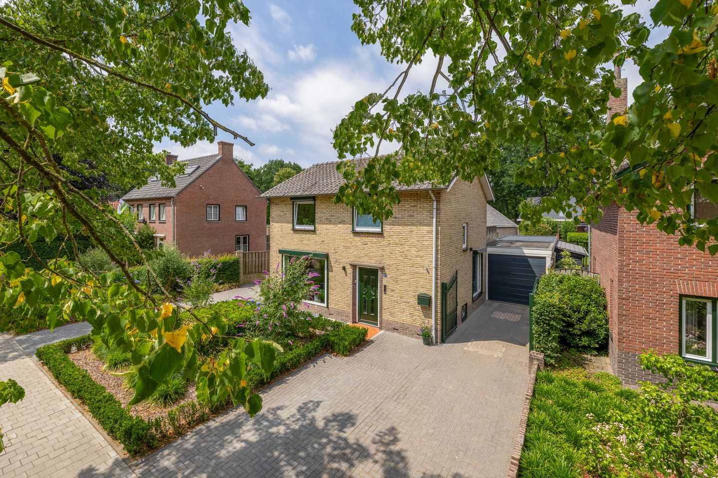 De tuin rondom het huis is vrij aangelegd en biedt veel privacy. De voortuin beschikt over twee opritten, waardoor je moeiteloos meerdere auto's, een camper of een caravan kunt parkeren.