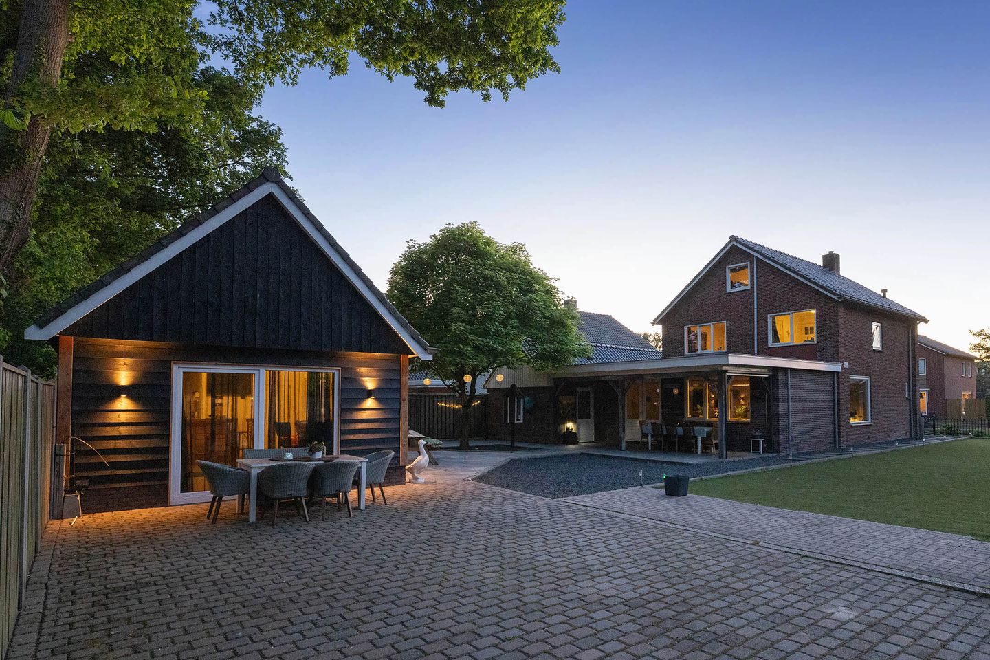 De achtertuin is gelegen op het zuidoosten en is prachtig aangelegd met een ruime overkapping. Hierdoor kun je met het hele gezin comfortabel buiten zitten, zelfs op de warmste dagen. Achter in de tuin bevindt zich een grote schuur van circa 40 m², die is uitgerust met een keukenblok, airconditioning en een toiletruimte. Deze schuur biedt genoeg ruimte voor het organiseren van feesten en partijen en is een ideale plek voor het opbergen van tuingereedschap en andere benodigdheden.