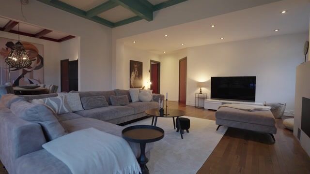De villa heeft meerdere leefruimtes met klassieke raampartijen, hoge plafonds en originele details. De woonkeuken vormt het hart van het huis, met dubbele deuren naar de tuin. De woonkamer met balkenplafond en pellet kachel voelt warm en uitnodigend.
