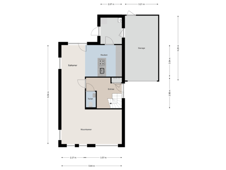 Begane grond: entree/hal met meterkast, toiletruimte voorzien van hangcloset en fonteintje, trapopgang en toegang tot de woonkamer. De woonkamer is ruim opgezet, met ruimte voor een eethoek en open keuken. Vanuit de keuken bereikt u de bijkeuken, waar zich de lucht-water warmtepomp, boiler (180 liter) en aansluitingen voor wasmachine en droger bevinden. Vanuit de bijkeuken is zowel de achtertuin als de garage/berging bereikbaar. De garage/berging beschikt over elektra, een elektrische kanteldeur en doorgang naar de tuin. De begane grond is verder voorzien van vloerverwarming (m.u.v. de
