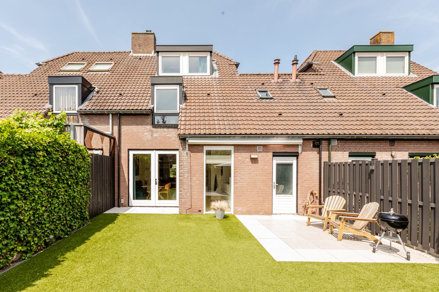 De achtertuin is volledig opnieuw aangelegd en ligt ideaal op het zuiden, waardoor u de hele dag door heerlijk van de zon kunt genieten. De tuin is modern en onderhoudsvriendelijk ingericht met een strak terras van keramische tegels, kunstgras en een leuk klimrek voor de kinderen. Dankzij de ligging en indeling is dit de perfecte plek om te ontspannen, buiten te eten of gezellig te borrelen met vrienden. De tuin is bovendien goed bereikbaar via de achterom, de bijkeuken of de openslaande deuren.