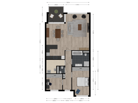 De technische ruimte wordt zo genaamd, omdat hier de opstelling is van o.a. de C.V.-ketel en aansluitingen voor uw wasmachine en droger. Daarnaast kunt u hier bijvoorbeeld ook de stofzuiger, strijkplank en overige zaken goed opbergen.