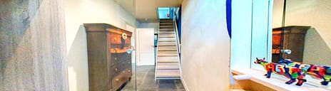 De entree vindt plaats in de ruime hal met de meterkast, een afsluitbare glazen schuifwand en de trapopgang. De hardstenen vloer is uitgerust met vloerverwarming. De sfeervolle eerste kamer is voorzien van een hardstenen vloer met vloerverwarming. Verder vind je hier een elektrische haard, waardoor het er het hele jaar door comfortabel is. De klassieke ramen met karaktervolle vensterluiken en de originele balkenplafonds zorgen voor een authentieke uitstraling. Momenteel in gebruik als slaapkamer, maar dankzij de ruime opzet voor diverse functies geschikt. Vanuit deze kamer bereik je bovendien zowel de tuin als de tweede 'kleinere' kamer. Deze laatste is eveneens voorzien van authentieke details, zoals de klassieke roedenramen en het balkenplafond. De aangrenzende badkamer beschikt over een ligbad met douchegelegenheid, mechanische ventilatie, een wastafel met wandkabinet, een zwevend toilet en een designradiator. Deze ruimte is voorzien van elektrische vloerverwarming.