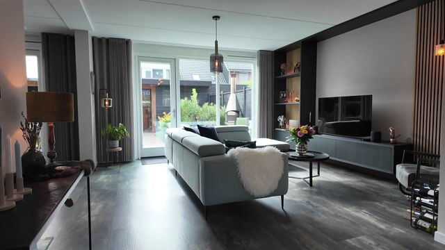 Je komt binnen in een nette, lichte hal met direct toegang tot het moderne toilet. Ook bevindt zich hier de meterkast die voorzien is van 3-fase en een wateronthardingssysteem. Vanuit hier stap je de royale woonkamer binnen: een heerlijke leefruimte met grote raampartijen en openslaande deuren naar de tuin. De verbinding tussen binnen en buiten is hierdoor zeer aangenaam. Aan de achterzijde is de woonkamer 8 meter breed Hierdoor is er meer dan genoeg ruimte voor een zithoek en een eethoek. Zowel de woonkamer als de eetkamer zijn voorzien van hoogwaardige, ruime inbouwkasten.