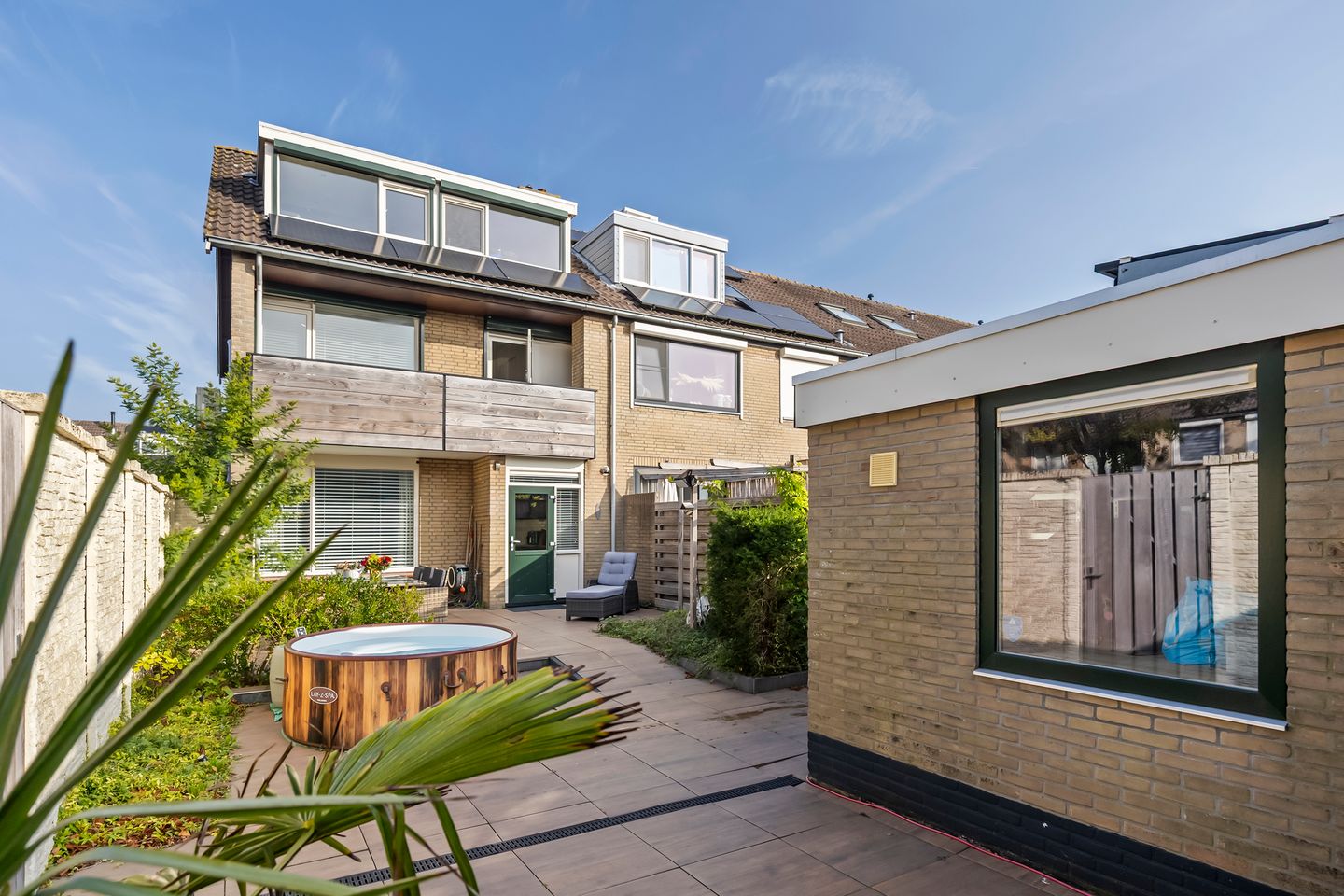 De tuin is grotendeels voorzien van lichte tegels, met een kleine border en een sfeervolle pergola die zorgt voor een gezellige uitstraling zonder dat je uren hoeft te tuinieren. Achterin de tuin vind je een heerlijke lounge overkapping – de perfecte plek om te ontspannen, een boek te lezen of gezellig met vrienden te borrelen tot de zon ondergaat. Direct daarnaast ligt de vrijstaande garage van maar liefst 23 m² – voorzien van een raam, een loopdeur naar de tuin en toegang via de Baijensweer.