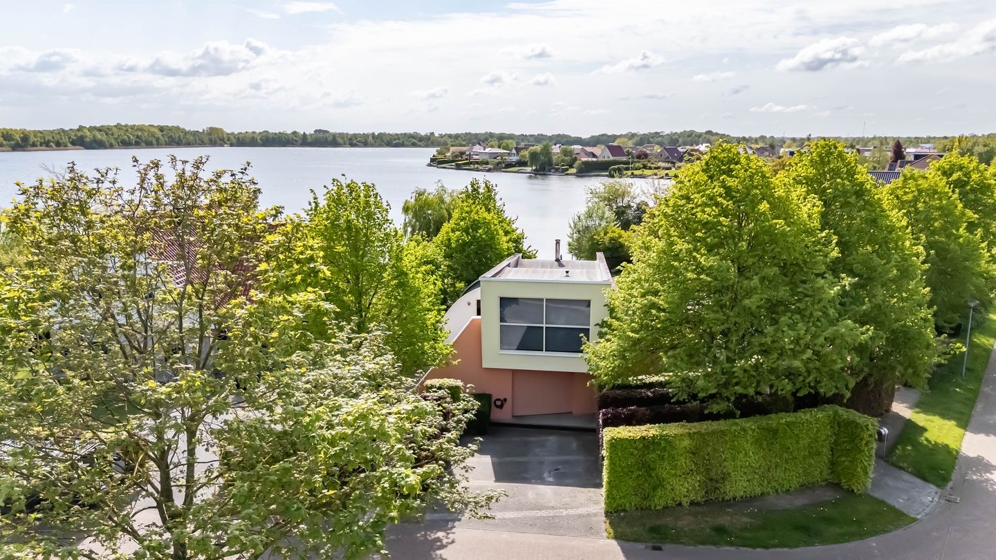 Het unieke karakter van deze villa wordt onderstreept door de eigentijdse architectuur en opvallende kleurstelling. Bijzonder is het splitlevel-ontwerp op de eerste woonlaag, waarbij de royale leefruimte met open keuken een fenomenaal uitzicht biedt over de tuin en het aangrenzende water. De inpandige garage bevindt zich in het souterrain, wat bijdraagt aan de strakke belijning van het exterieur.