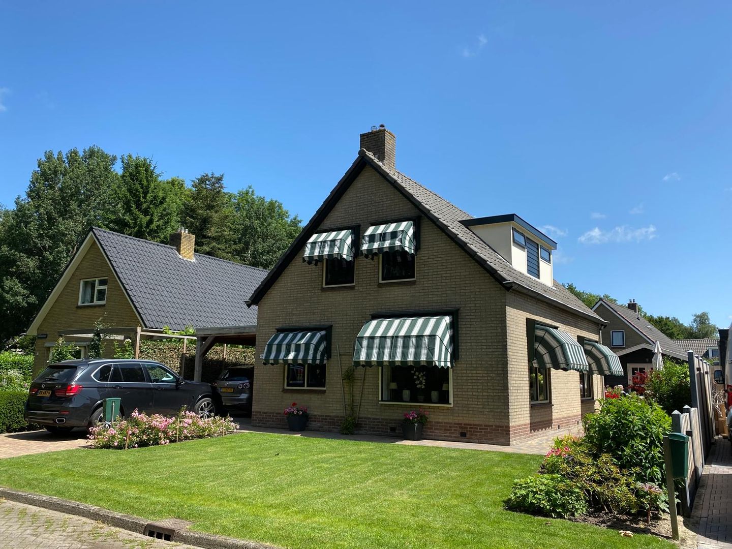 Aan de voor- en zijkant van de woning zijn de ramen, zowel op de begane grond als op de verdieping, voorzien van markiezen en je hebt zicht op groen aan de voorzijde.