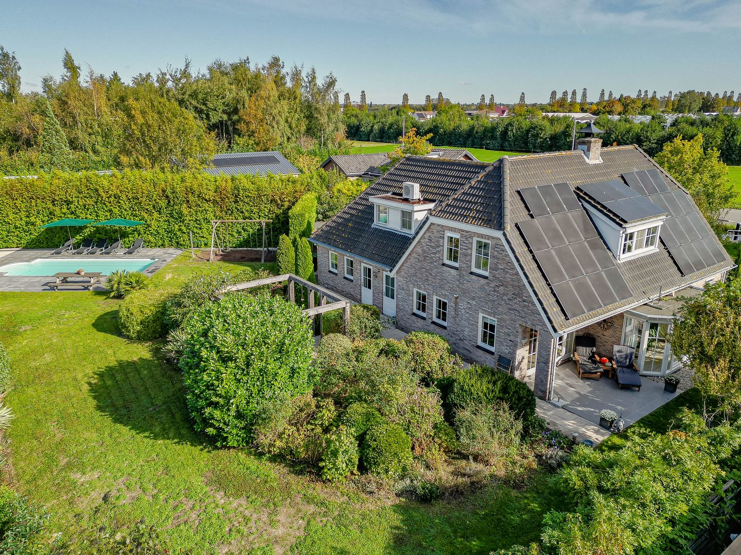 De fraai aangelegde tuin biedt volop privacy. Kinderen kunnen hier vrij spelen, er is ruimte voor speeltoestellen en/of het inrichten van een moestuin. Op het terras en onder de pergola kunt u heerlijk buiten dineren en ontspannen. Op warme zomerdagen zorgt het zwembad voor een verkoelende duik.