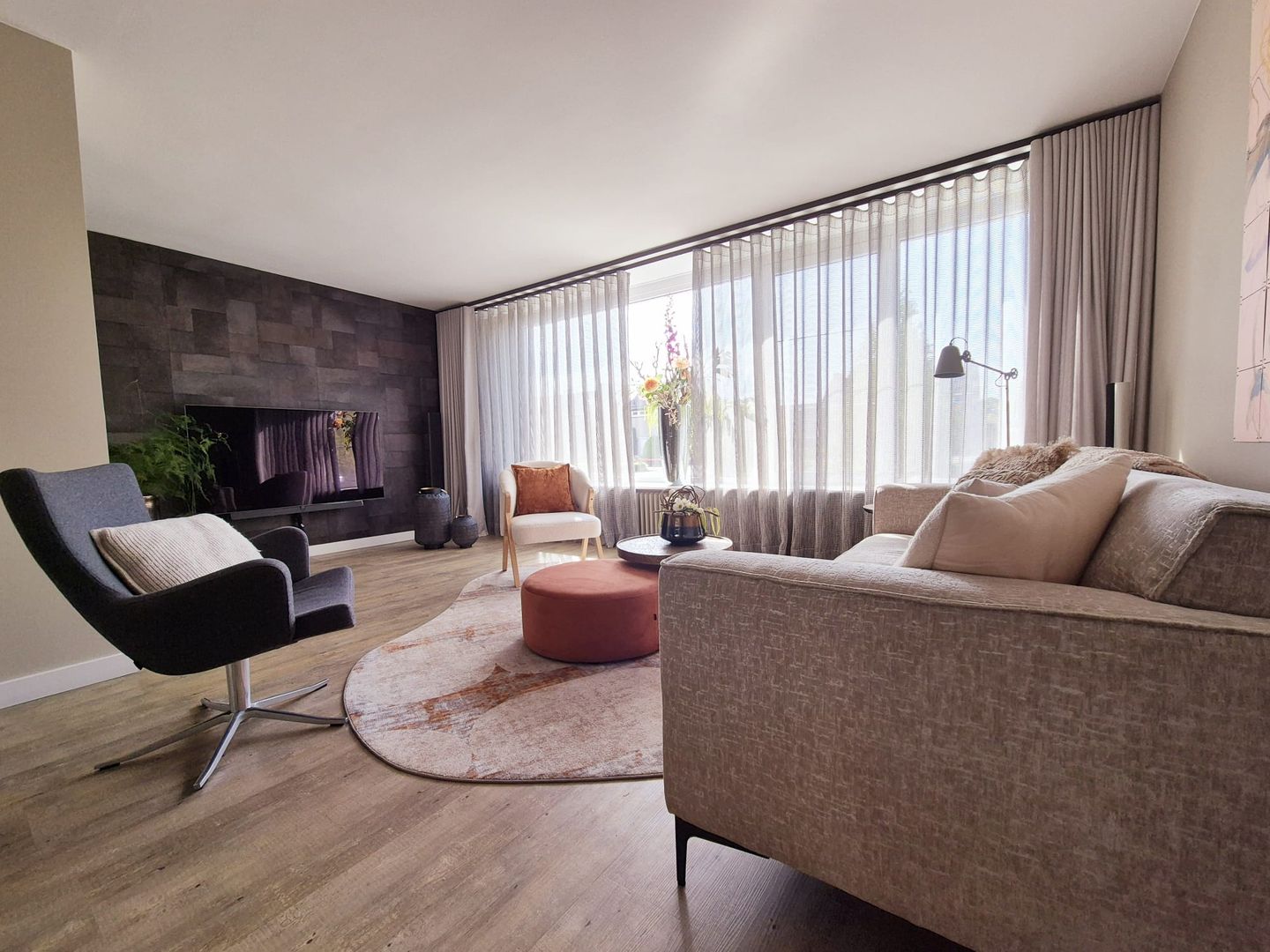* Sfeervolle woonkamer met pvc vloer en vernieuwde pui aan de achterzijde in 2019