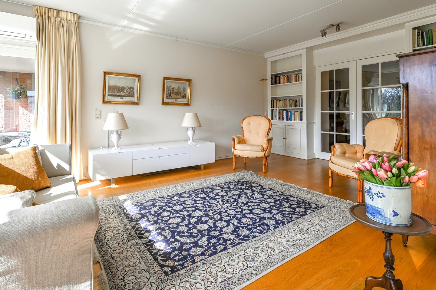 Entree, ruime hal. De hal is van de woonkamer gescheiden door een fraai suite-stel met aan weerszijden vaste kasten; aan de halzijde onder andere een garderobekast en bergkast, en aan de woonkamerzijde stijlvolle boekenkasten. De glazen suitedeuren zorgen voor een prettige lichtinval en een mooie verbinding tussen hal en woonkamer.