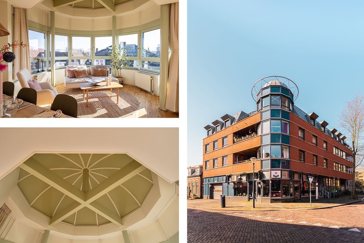 3e verdieping: meterkast; inpandige toegang tot het appartement; lichte hal/gang (door de dakkoepel) met cv-kast, nette toiletruimte met fonteintje en inpandige berging voorzien van wasmachineaansluiting; slaapkamer; badkamer voorzien van ligbad, douche (in bad), wastafel en 2e toilet; 2e slaapkamer; ruime speels ingedeelde living met fraaie koepel en deur naar balkon; ruime U-vormige open keuken.