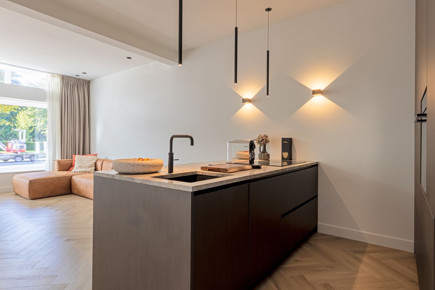 De moderne nieuwe open woonkeuken is uitgerust met alle nieuwe apparatuur van Siemens studioline. Het kookeiland is voorzien van een innovatieve Bora inductiekookplaat met geïntegreerde recirculatieafzuiging. De badkamer en toilet zijn eveneens van hoog niveau: grote tegels, stijlvolle inbouwkranen, opzetwastafels en een royale inloopdouche met handdouche en regenstortdouche.