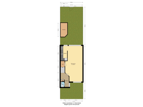 Begane grond: entree met meterkast, toilet met fontein, woonkamer met semi open keuken inclusief Smeg fornuis en afzuigkap, toegang naar de achtertuin met stenen berging en achterom;