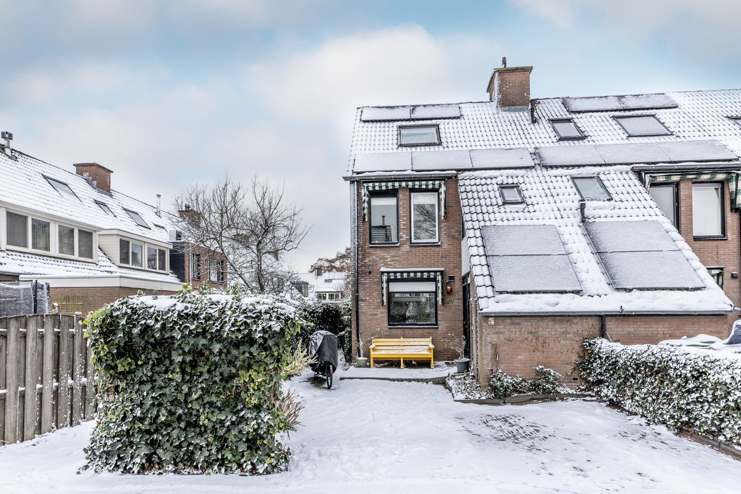 Vanuit de woonkamer kan je de achtertuin in. In de de tuin staat een houten schuur, en er is een achterom naar de straat. Naast de woning heb je nog een flink strook eigen grond, handig om deze extra ruimte te hebben.