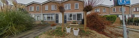 We komen aan bij de woning en worden verwelkomd door een nette voortuin met sierlijke knotboompjes, een verhoogde border met groen en een strak betegeld pad. Rechts naast de woning bevindt zich een praktische doorgang naar de achterzijde. De woning ligt aan een brede weg in een rustige wijk, met ruim voldoende parkeergelegenheid in de directe omgeving.