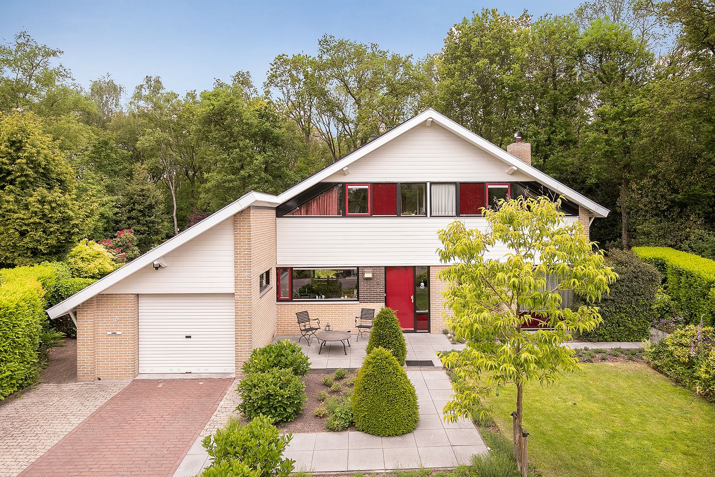 De royale leefruimte biedt een ruime zitruimte met een groot raam aan de voorzijde, terwijl een grote schuifpui naar het terras en de achtertuin aan de achterzijde een naadloze overgang naar buiten mogelijk maakt. De eethoek biedt een schitterend uitzicht over de fraai aangelegde tuin en het eigen bos.