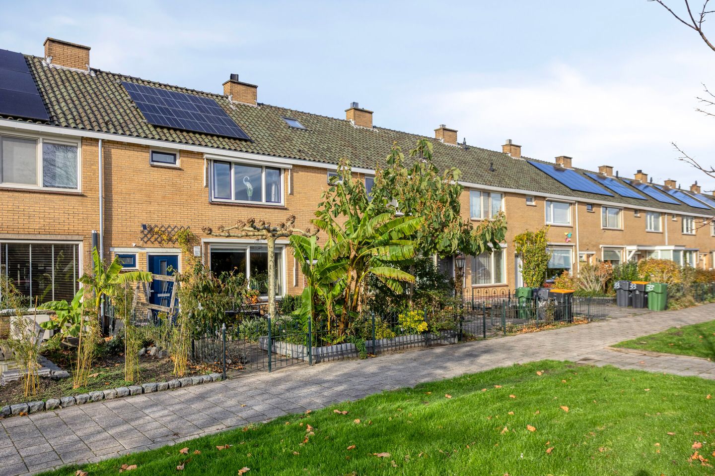 Voortuin: De voortuin is groen en biedt veel privacy dankzij de vaste beplanting, waaronder een plataan en een banaanplant. Voor de tuin ligt nog een stukje gemeentegroen, wat zorgt voor een prettige, natuurlijke uitstraling aan de voorzijde van de woning.