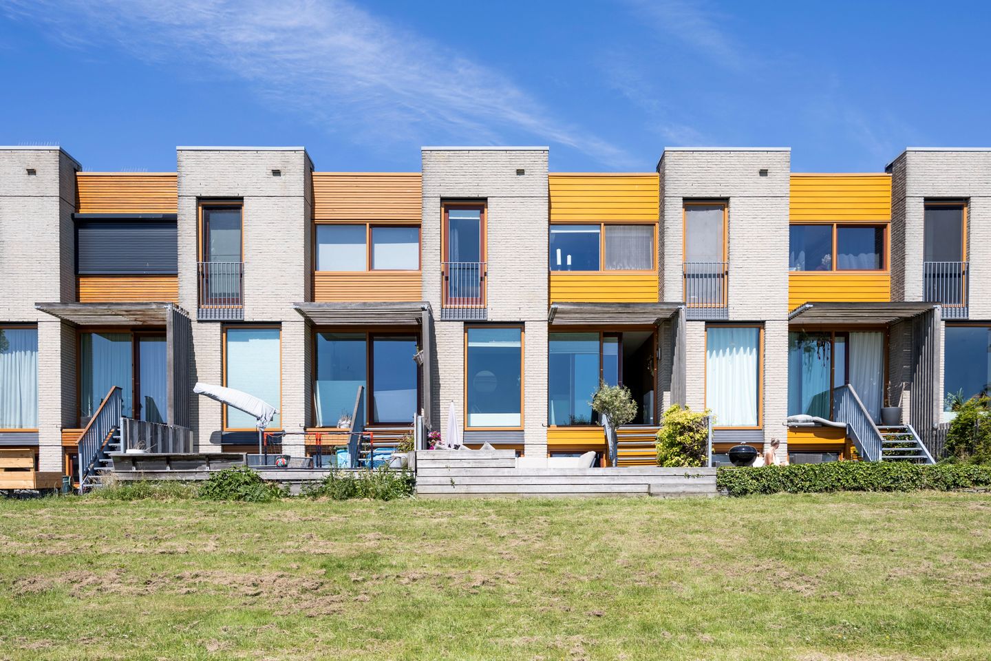 The modern kitchen at the front of the house is laid out in a stylish U-shape with a welcoming bar area and features a dishwasher, fridge/freezer combo, combi-oven, sink, boiling water tap (Quooker), flexizone induction hob with integrated extraction, and plenty of worktop and cupboard space. At the rear is the spacious living room, which opens through a large sliding door onto the sunny terrace. Here you’ll enjoy views of the green Land van Luna! Via the terrace and the outdoor stairs, you reach the sunny garden, where your family can relax while the children play safely.