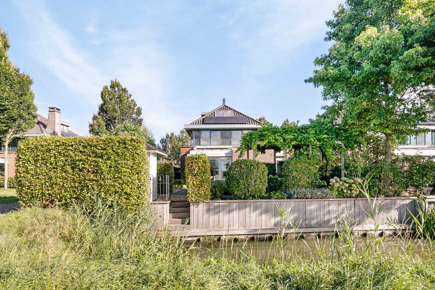Rondom de woning ligt een prachtig aangelegde tuin biedt volop privacy, met veel groen, diverse terrassen, prachtige planten borders, buitenkraan aan voor- en achterzijde en buitenberging. Aan de achterzijde grenst de tuin aan een brede sloot, met een schitterend vrij uitzicht over groengebied "Buitenland". Eigen oprit met ruime parkeergelegenheid.
