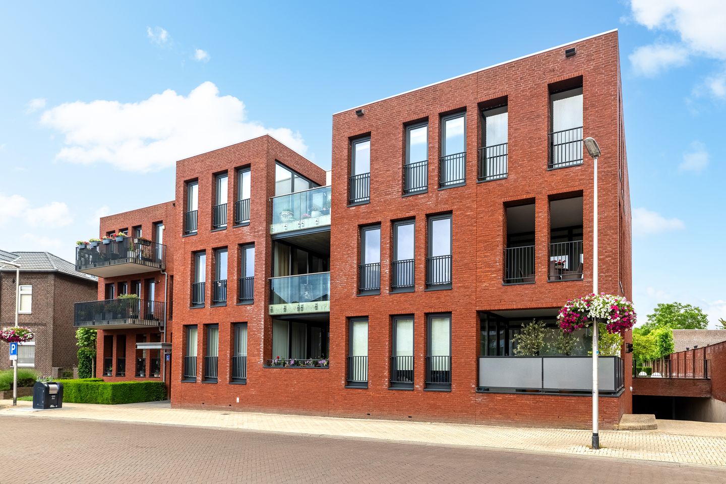 Het appartementencomplex bestaande uit drie losse gebouwen met aan straatzijde de hoofd-entree en toegang tot de inrit van de parkeergarage.