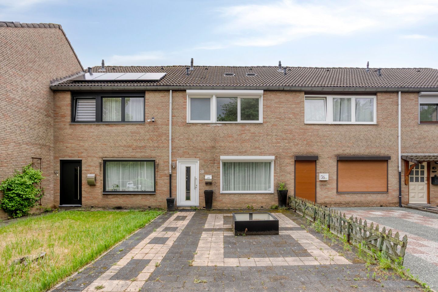 Betegelde voortuin.