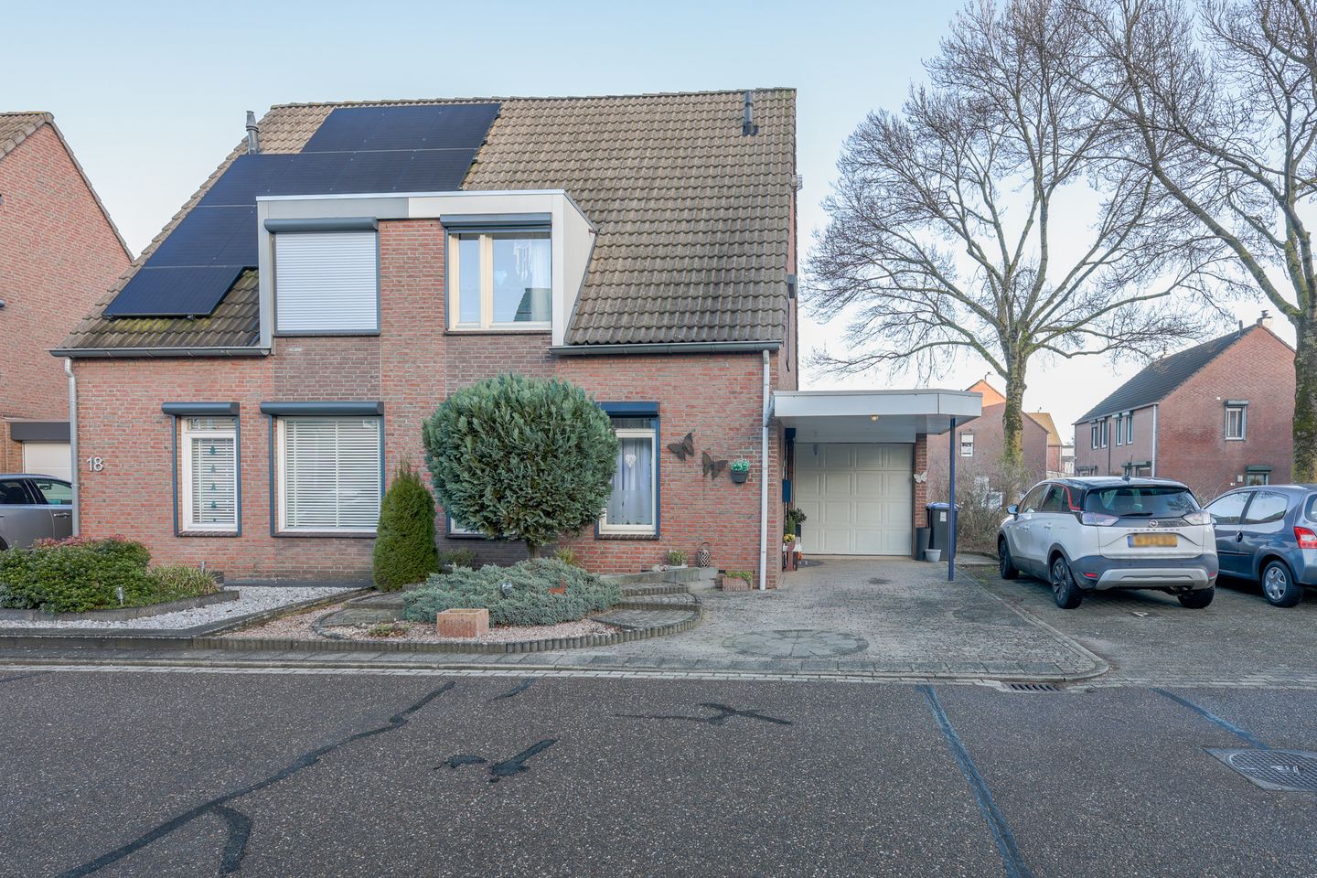 Voortuin met zijdelings een oprit met carport. De achtertuin is verzorgd aangelegd en voorzien van een grote overkapping( 5.22/3.27m) , diverse aanplant en een zijingang. In de achtertuin geniet men van veel privacy.