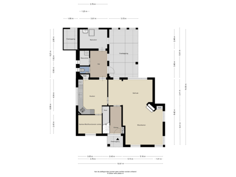 De overdekte entree aan de voorzijde geeft toegang tot de hal met meterkast, trapopgang en de ruime woonkamer.